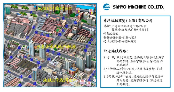 中国上海市静安区海宁路899号长泰企业天地广场304室 电话:0086-21-6139-5835 传真:0086-21-6139-5836 Email:sanyo-m@sanyo-m.com.cn 邮编:200071 www.sanyo-m.com.cn